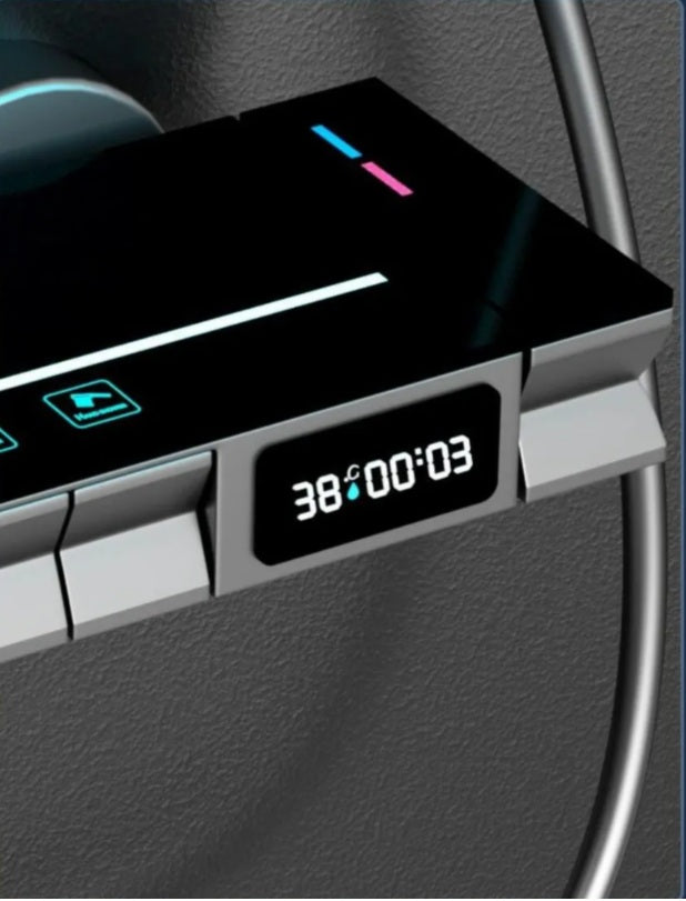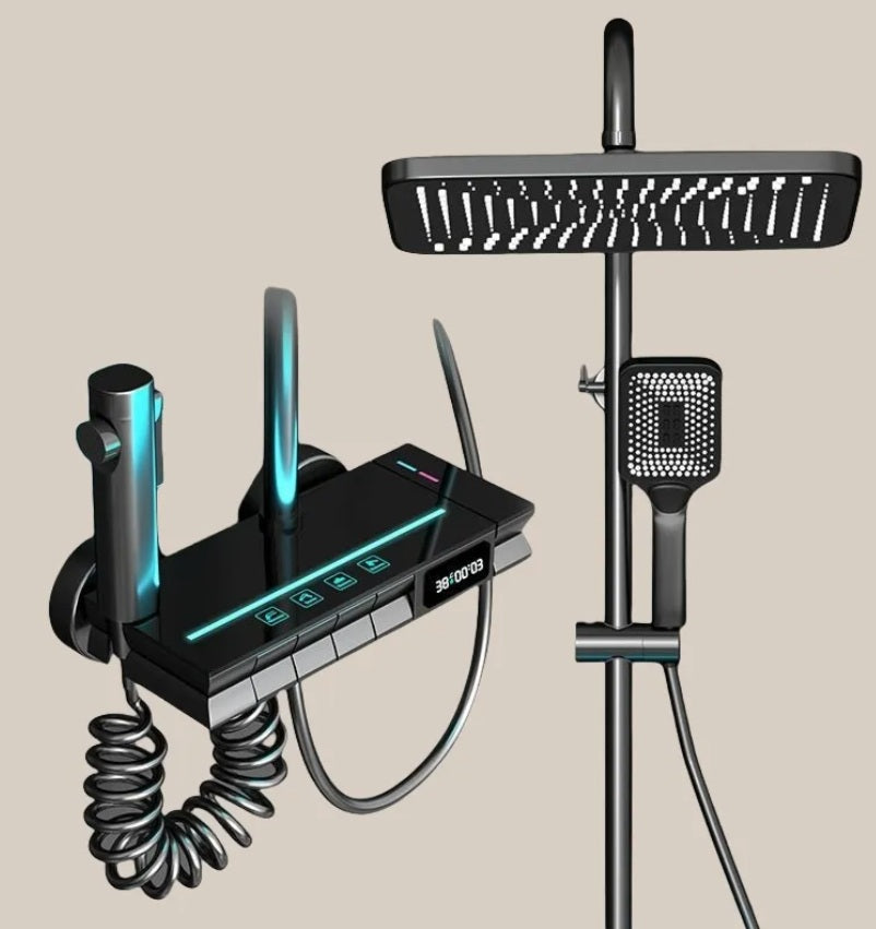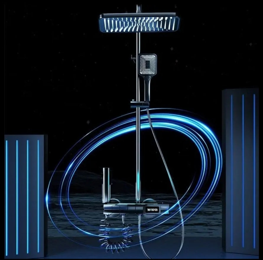 Product Name LED Display Shower Set Model Number: QL-133 Number of Handles: Dual Handle Shower Head Shape: Square Spray Pattern: Rain, Soft, Jet, Massage Product Name Shower Set Temperature Display: Yes Function:4 Function Body Material: Brass Installation: Wall Mounted Color: Black