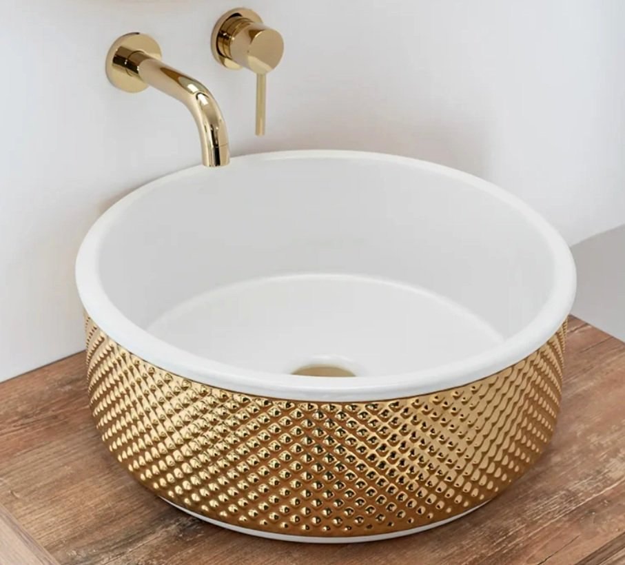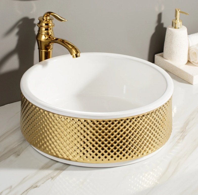 Introduce a bold statement piece to your bathroom with Gold Embossed Ceramic Basin, where luxury meets modern texture. This round, above-counter basin features a dazzling gold hammered lattice exterior combined with a sleek white ceramic interior — a design that radiates opulence and craftsmanship.