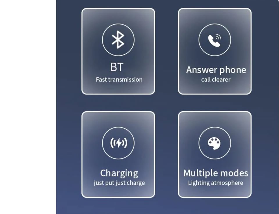 Parameters: 1. Bluetooth Version: V 5.1 2. Wireless charging: 10W 3. Functional features: Bluetooth, USB, TF, AUX, TWS, FM, six LED atmosphere lights, wireless charging 4. Horn power: 4 Ω 5W 5. Material: ABS+PC 6. Playback time: 3-6H 7. Charging time: 2-3H 8. Transmission range: 10m 9. Battery: 5V/1200 mAh 10. Product size: 235 * 80 * 238mm 11. Net weight of product: 770g